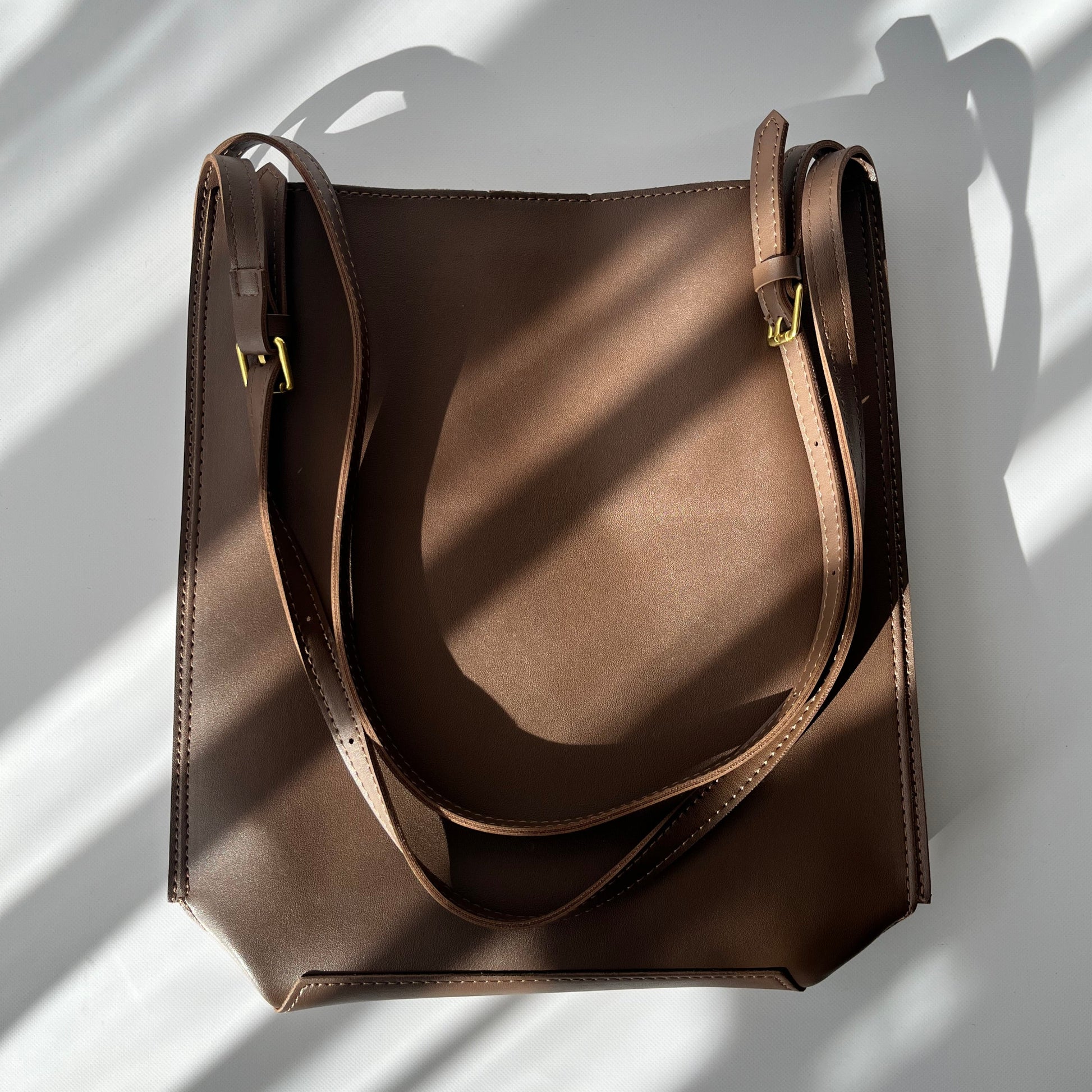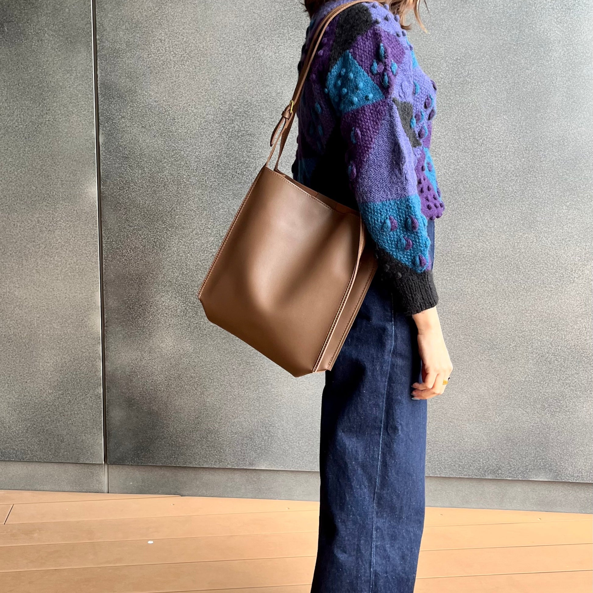 直線的なラインと柔らかな落ち感が共存する、ミニマルなトートバッグ。