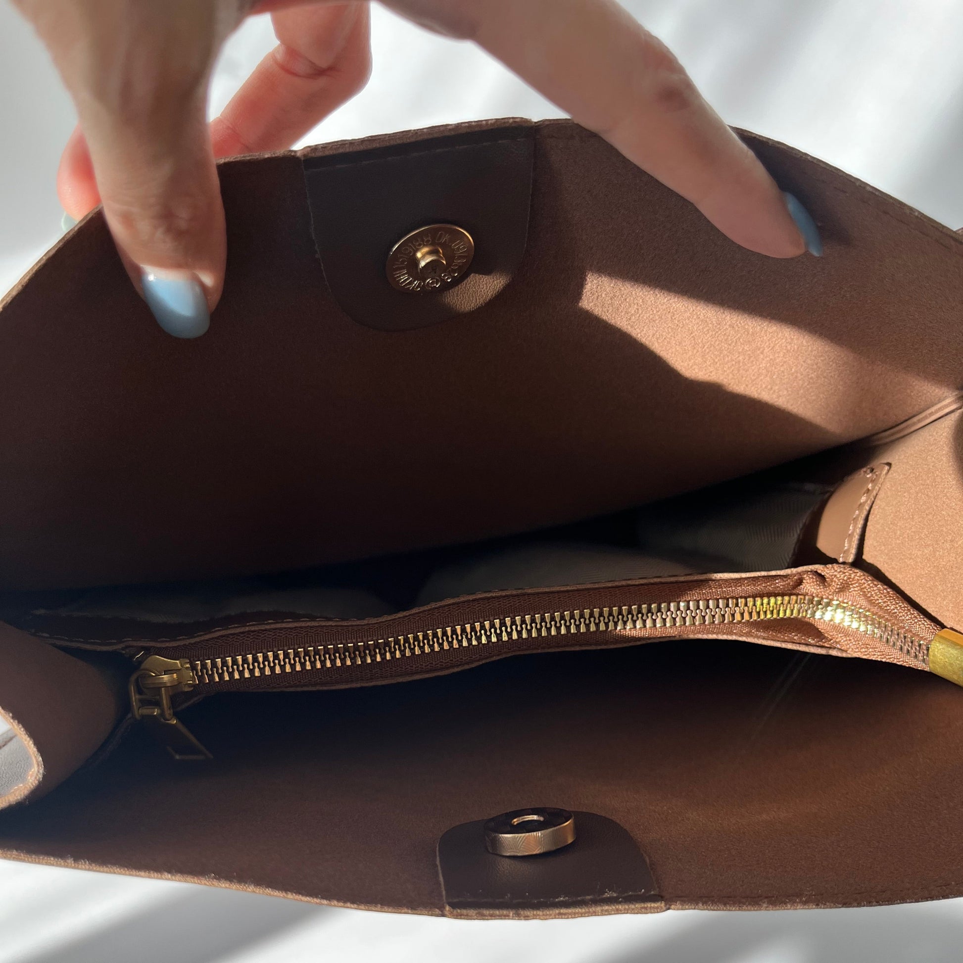 バッグの中央にはファスナー付きの仕切りポケットを配置。