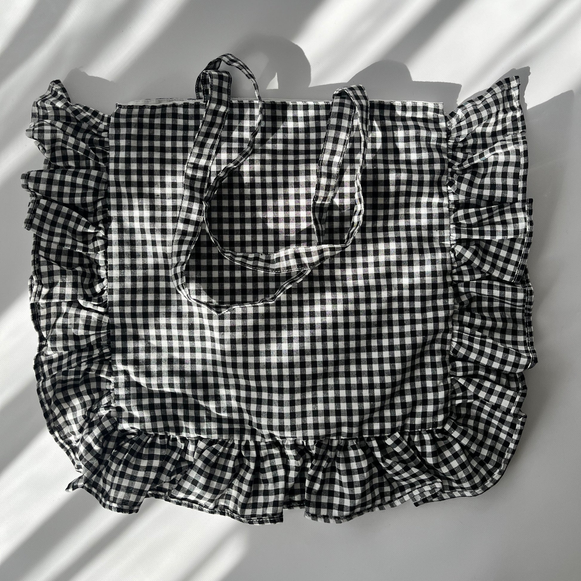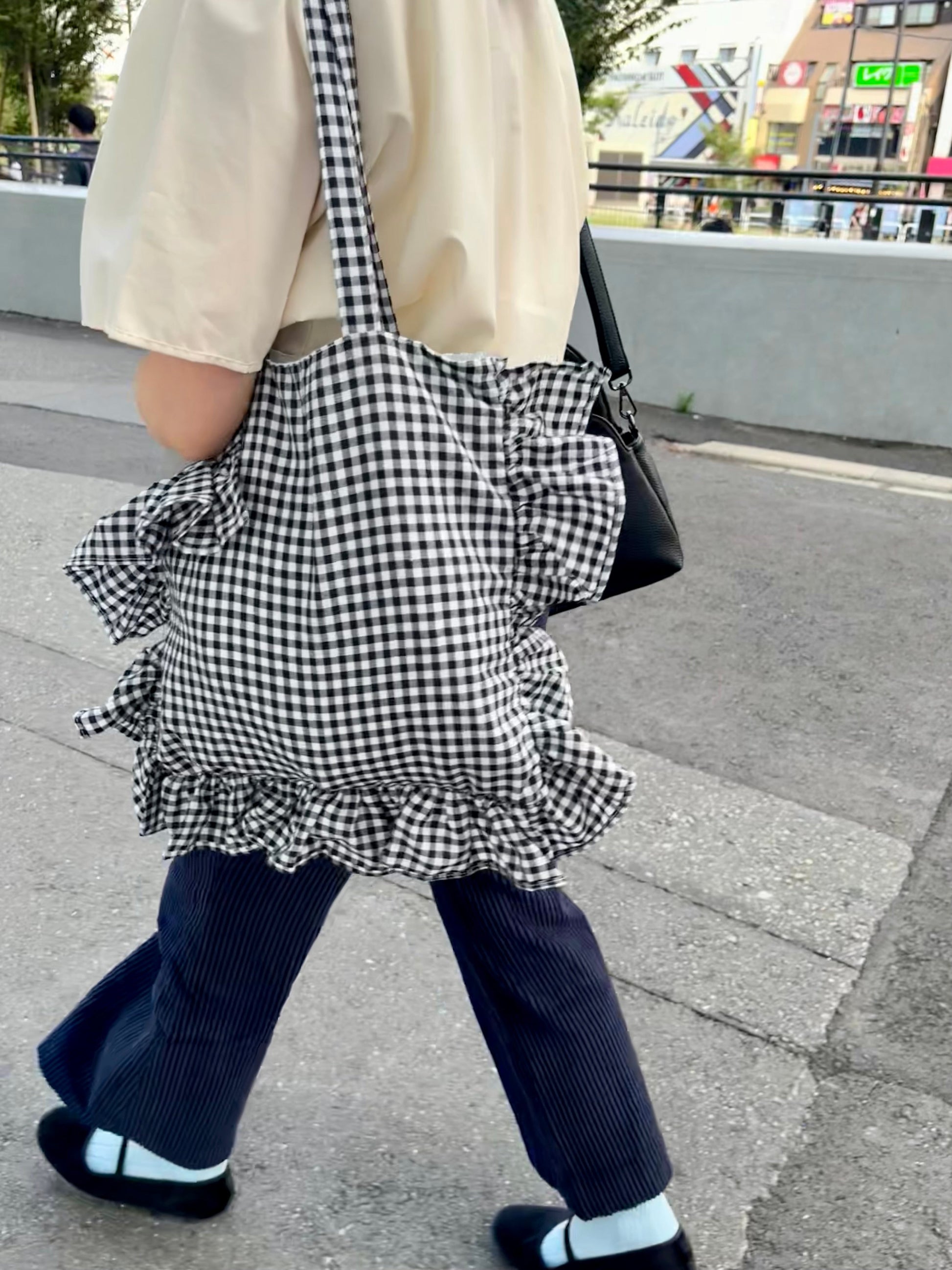 クラシカルなギンガムチェックに、柔らかなフリルを添えたトートバッグです。